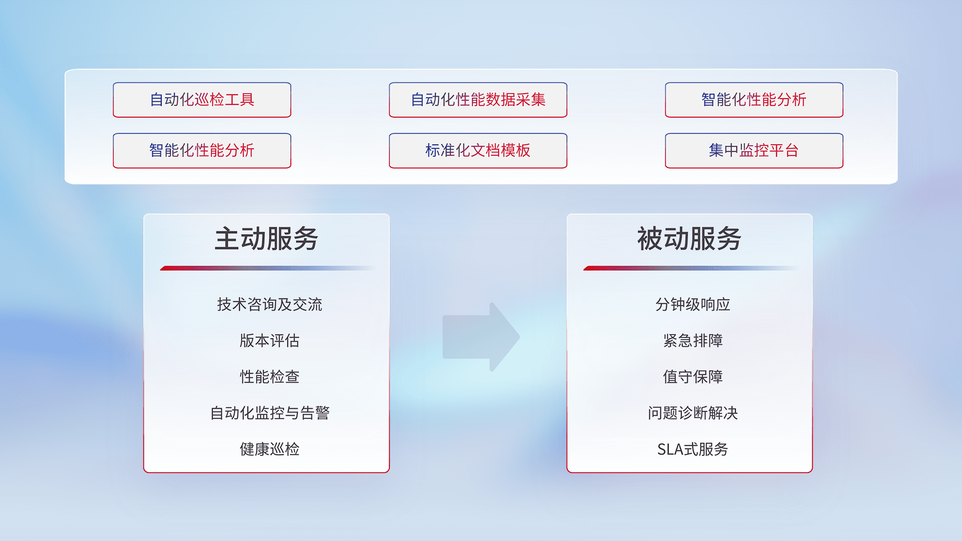 智能化工具和标准化文档,,,保障服务质量,,提供主动服务(包含技术咨询、、、、版本评估、、、、性能检查、、自动化监控与告警、、、健康巡检)和被动服务包含(分钟级响应、、紧急排障、、、、值守保障、、、、问题诊断解决、、SLA服务)。。。。